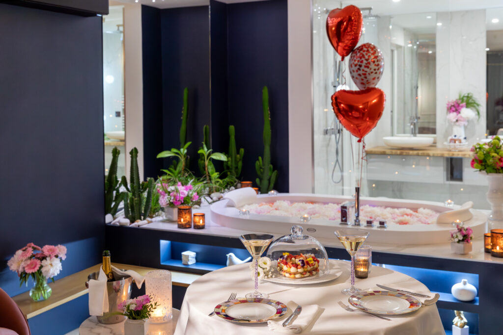 Si vous choisissez de dîner en extérieur, pour continuer votre soirée dans votre belle chambre, une jolie table sera dressée, vous pourrez déguster un délicieux et magnifique gâteau en forme de coeur, ce gâteau exceptionnel est réalisé par un Maître pâtissier, ce gâteau sera accompagné d’une bouteille de champagne et ses flûtes.