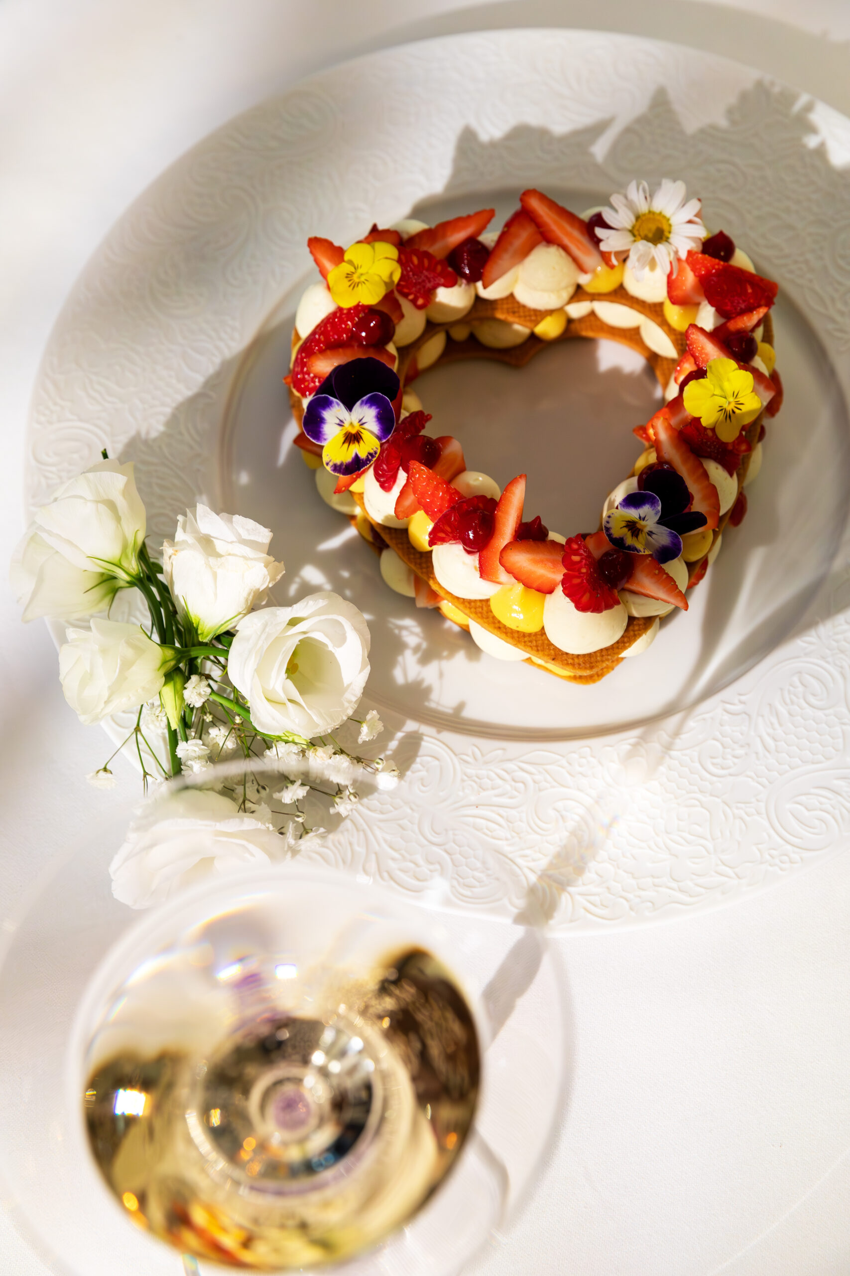 Si vous choisissez de dîner en extérieur, pour continuer votre soirée dans votre belle chambre, une jolie table sera dressée, vous pourrez déguster un délicieux et magnifique gâteau en forme de coeur, ce gâteau exceptionnel est réalisé par un Maître pâtissier, ce gâteau sera accompagné d’une bouteille de champagne et ses flûtes.